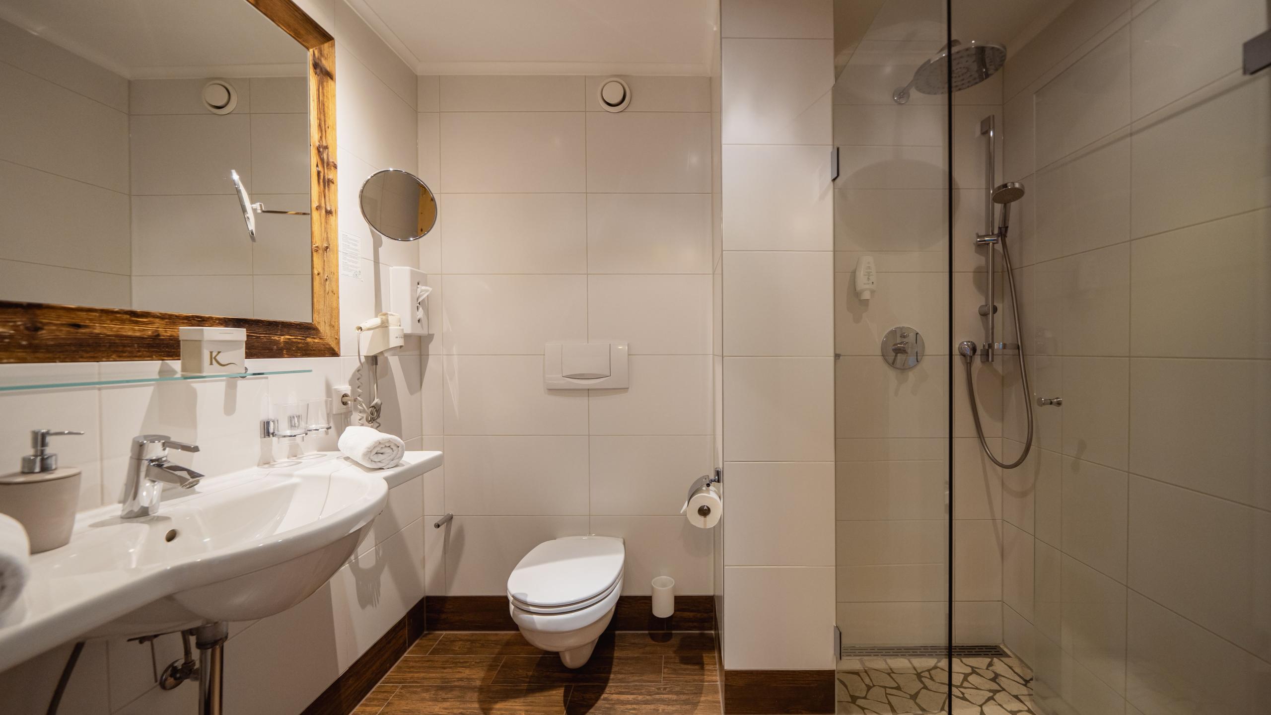 Double room with box-spring bed, cosy sitting area, entrance area with large wardrobe and coat rack, bathroom with rainfall shower, toilet, hairdryer, and make-up mirror, desk, telephone, and satellite TV, as well as balcony with views of Lake Achensee. A wellness bag with bathrobes and towels will be waiting for you in your room upon arrival.