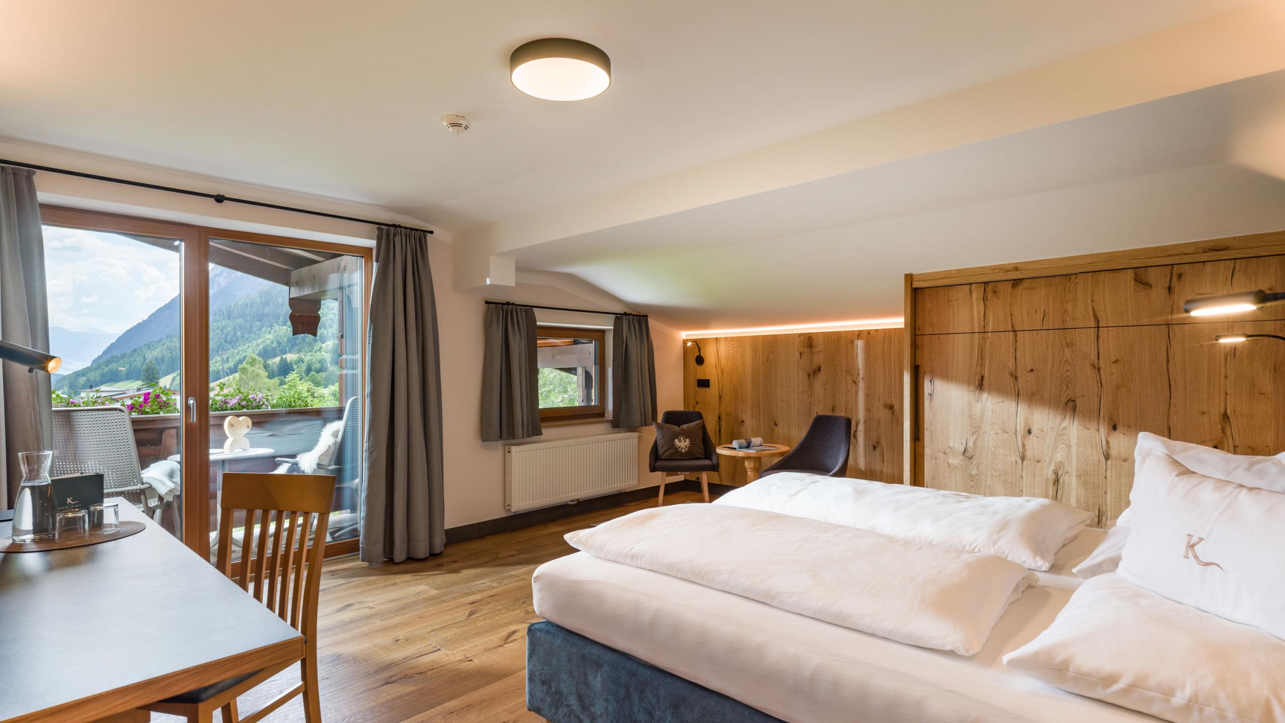 Doppelzimmer mit Boxspringbett, Holzfußboden, Kuschelcouch, Panoramafensterfront, großer Schrank und Garderobe, modernes Badezimmer mit Dusche, WC, Föhn und Kosmetikspiegel, Schreibtisch, Telefon und SAT-TV sowie Balkon mit herrlichen Blick auf den Achensee. Bei eurer Ankunft steht eine Wellnesstasche mit Bademänteln und Badetüchern für Euch bereit.