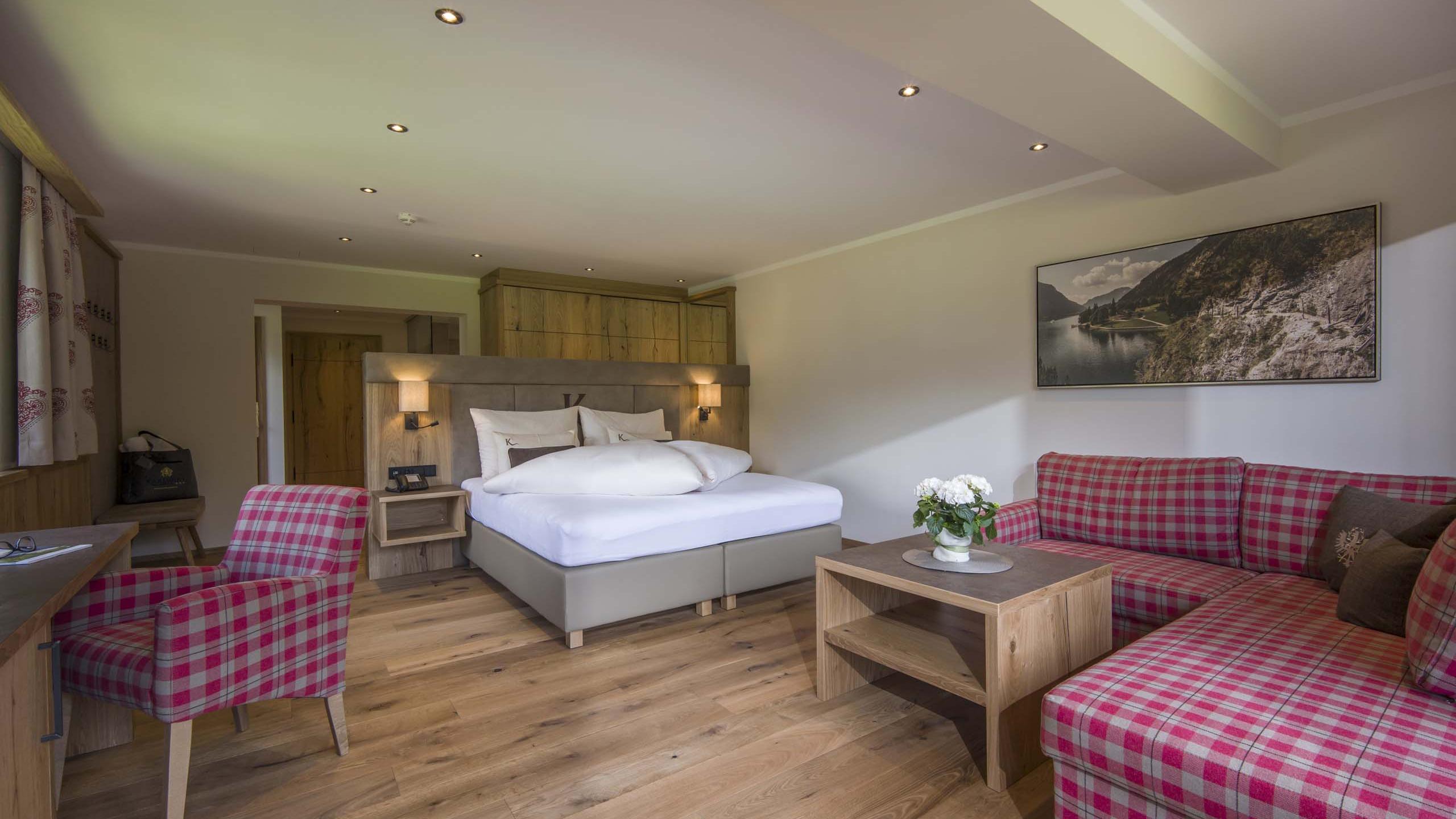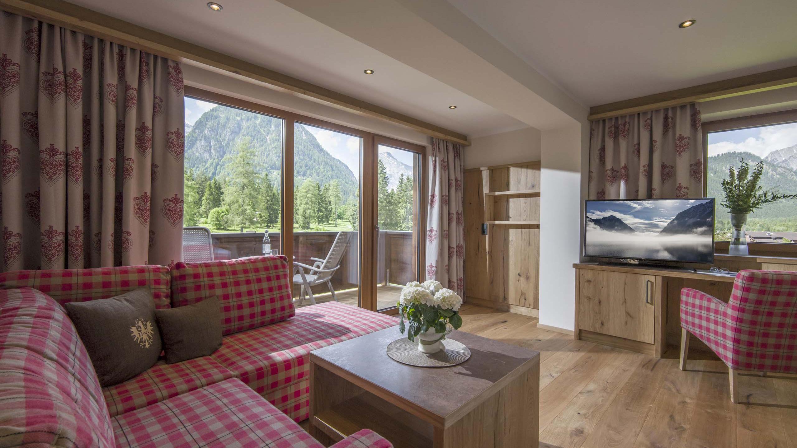 Suite im alpinen Stil mit großem Wohnschlafraum samt Boxspringbett, Kuschelcouch, Schreibtisch, Telefon, SAT-TV, Holzboden und unvergleichlicher Wohlfühlatmosphäre, begehbarem Schrank, Garderobe, großes, modernes Badezimmer mit Dusche, Föhn und Kosmetikspiegel, separatem WC, zwei Sonnenbalkonene mit Blick auf den Alpenpark Karwendel. Bei eurer Ankunft steht in eurem Zimmer eine Wellnesstasche mit Bademänteln und Badetüchern bereit.