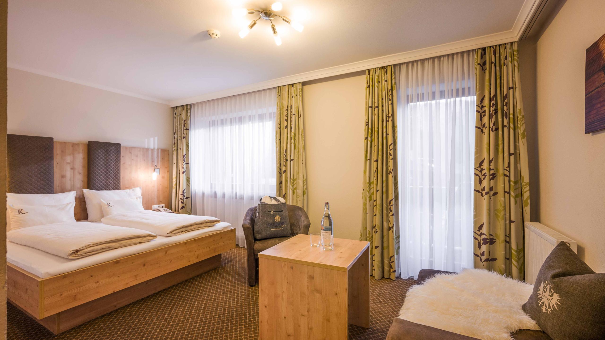 Wohnschlafraum mit Boxspringbett und kleine Kuschelcouch, SAT-TV und Telefon, Verbindungsgang zum separaten Kinderzimmer mit Etagenbetten und eigenem SAT-TV sowie Schreibtisch, großem Schrank, modernes Badezimmer mit Regenschauerdusche, WC, Föhn und Kosmetikspiegel, Balkon mit Blick auf den Alpenpark Karwendel. Bei eurer Ankunft steht in eurem Zimmer eine Wellnesstasche mit Bademänteln und Badetüchern bereit.