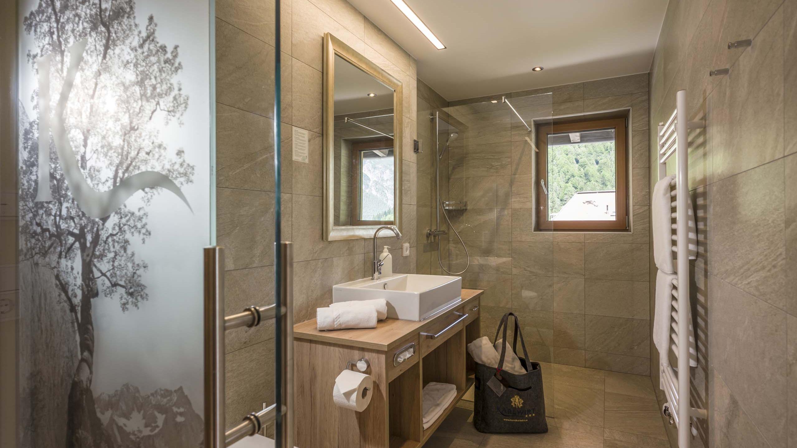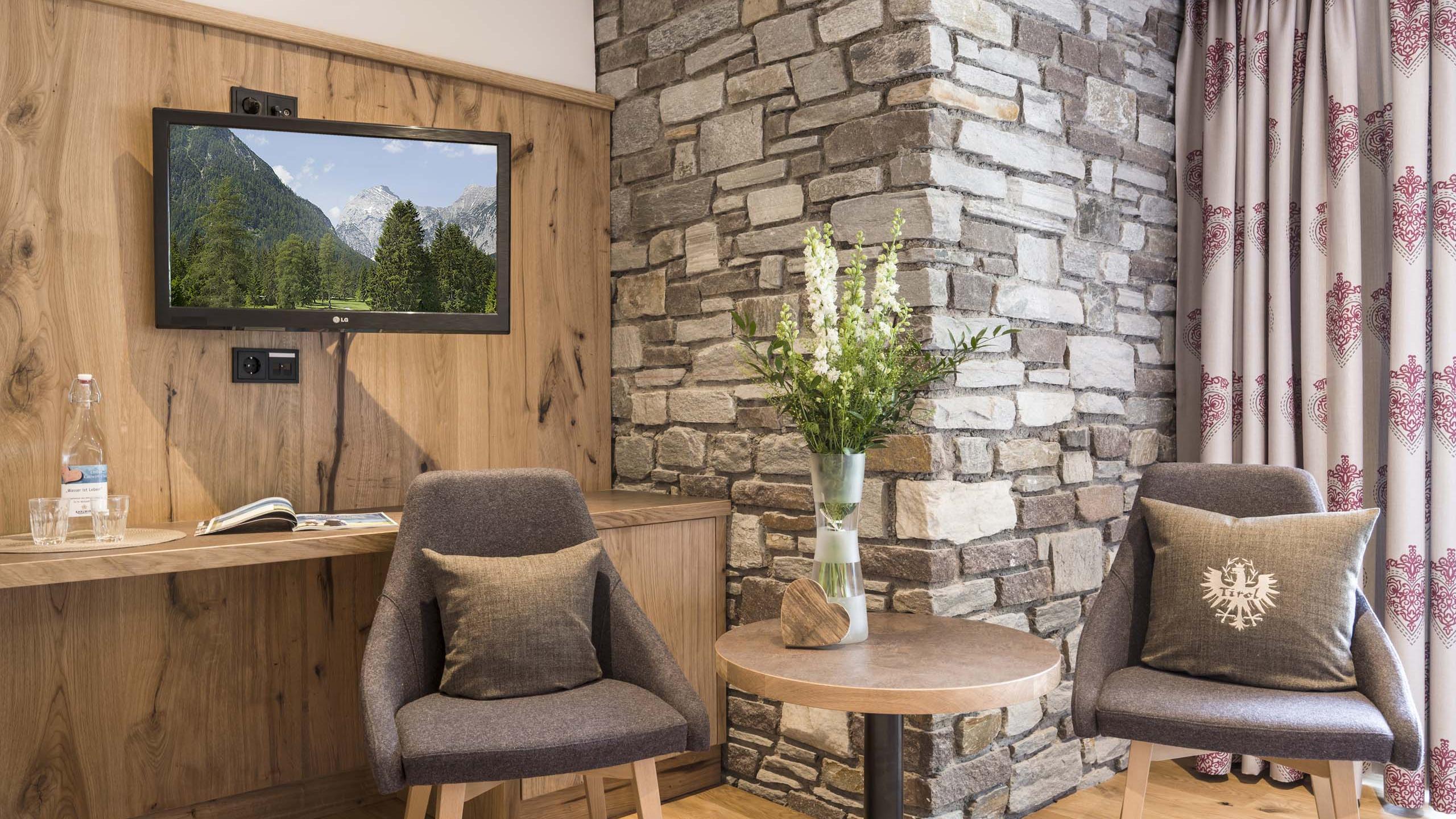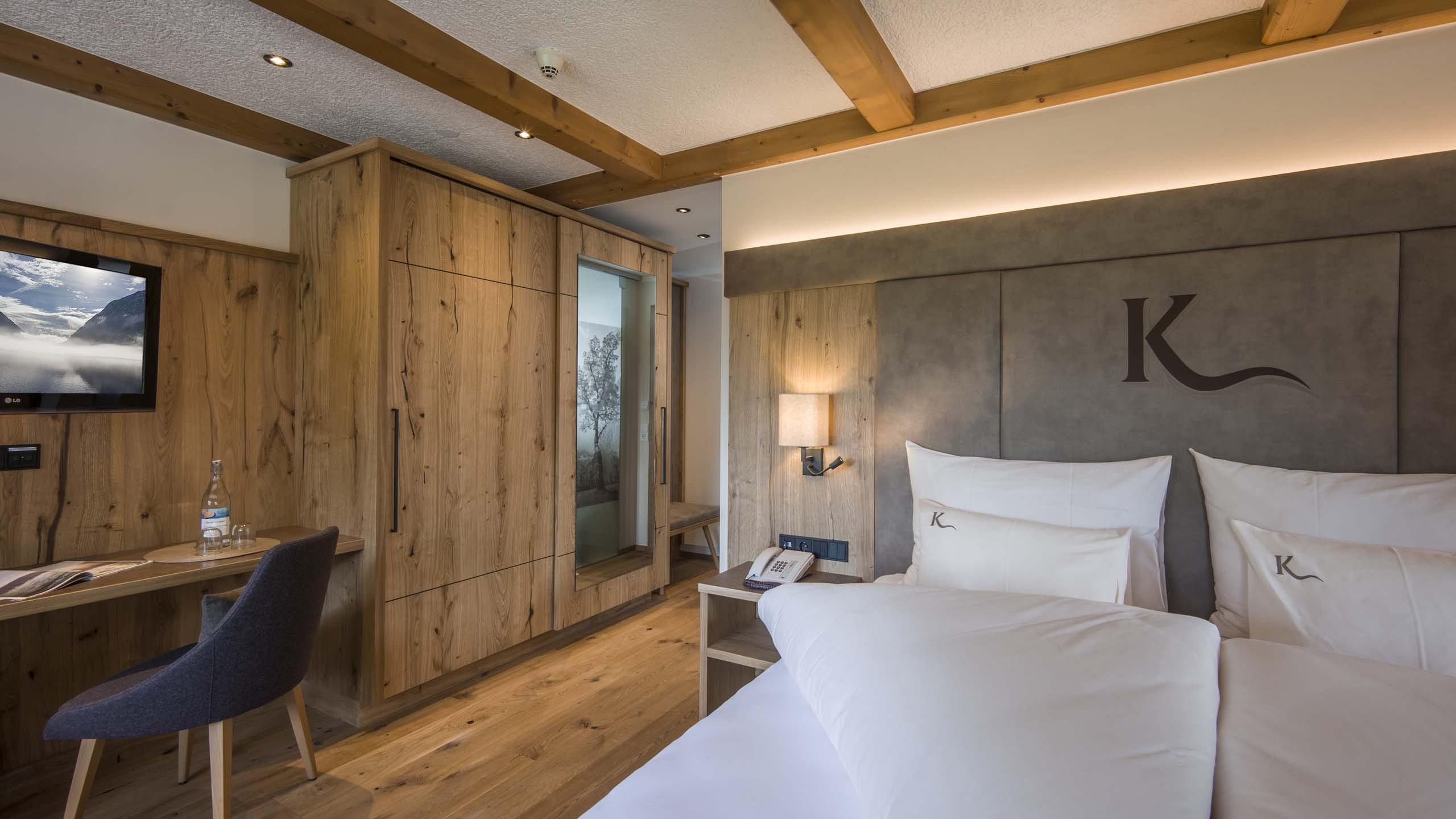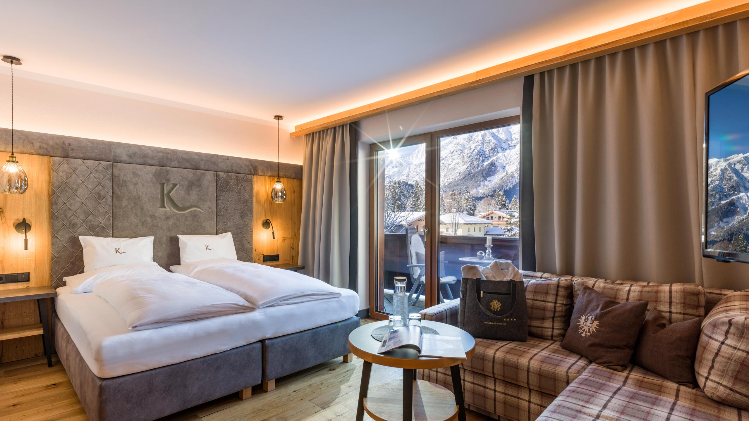 Doppelzimmer mit Boxspringbett, großer Schrank, gemütliche Sitzgelegenheit, Garderobe, SAT-TV, Telefon, modernes Badezimmer mit Dusche, WC, Föhn und Kosmetikspiegel, Balkon mit Bergblick. Bei eurer Ankunft steht eine Wellnesstasche mit Bademänteln und Badetüchern für Euch bereit.