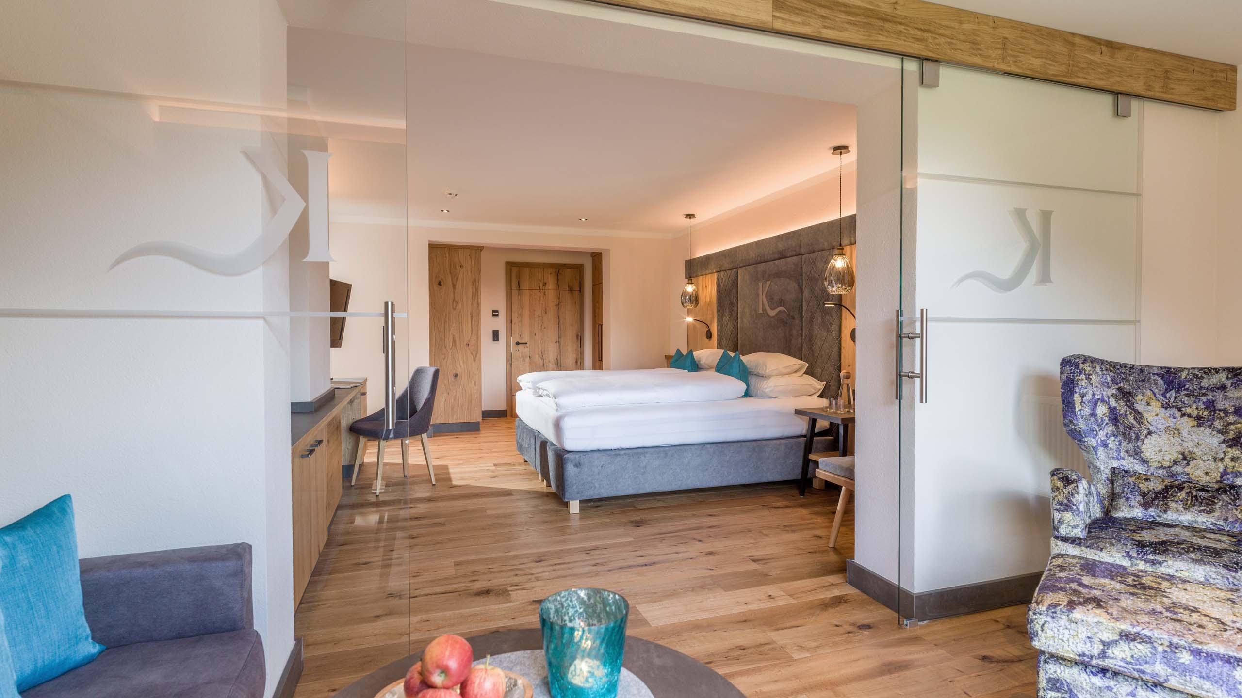 Suite im alpinen Stil mit großem Wohnschlafraum samt Boxspringbett, Kuschelcouch und unvergleichlicher Wohlfühlatmosphäre, großem Schrank, Garderobe, modernes, neues Badezimmer mit Dusche, Föhn und Kosmetikspiegel, separatem WC, Telefon und SAT-TV sowie Balkon mit herrlichen Blick auf den Achensee. Bei eurer Ankunft steht eine Wellnesstasche mit Bademänteln und Badetüchern für Euch bereit.